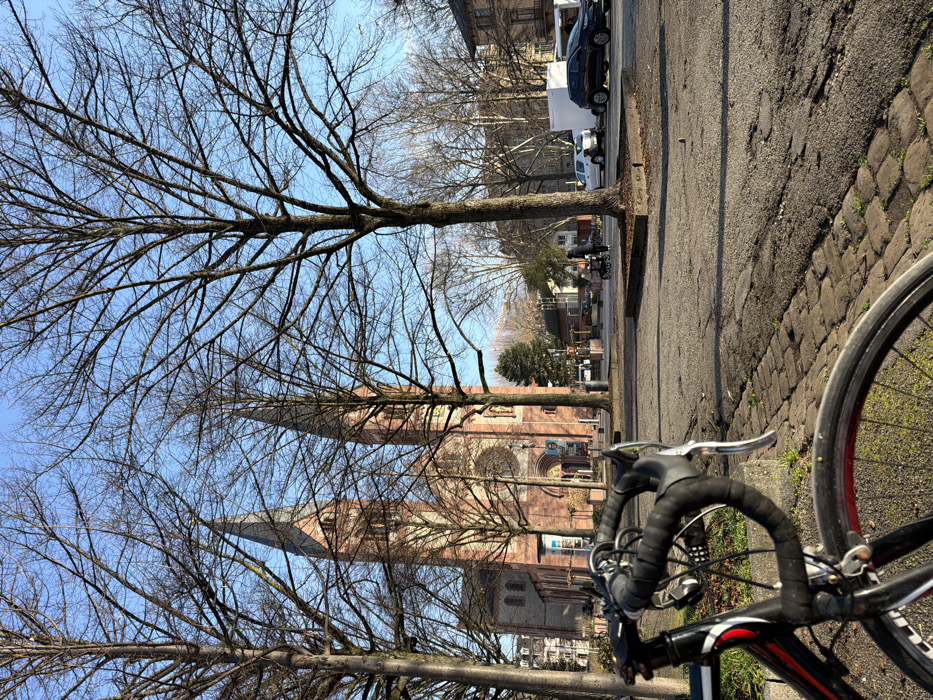 The image displays an urban scene in Heidelberg, Germany, centered on the Providenzkirche (Church of Providence) located at Karl-Ludwig-Straße 5. The photograph is taken from a low angle, looking towards the church from a paved area, likely a public square or street intersection such as the area around Poststraße or Anlage. In the immediate foreground, the handlebars and a portion of the front wheel of a black racing bicycle, featuring a red stripe on its rim, are visible on the left. The bicycle rests on a surface consisting of cobblestones that transition into asphalt pavement. The midground is characterized by several tall, bare deciduous trees, one centrally positioned with a wide canopy of branches, silhouetted against the sky. Behind these trees, the Providenzkirche is prominent, a large structure built of reddish-brown stone, featuring two symmetrical, pointed spires topped with dark gray roofs. Its facade includes a large circular rose window and arched entrances. To the right of the central tree, a person dressed in dark clothing is pushing a dark baby stroller or pram across the paved ground. Further right, two vehicles—a white hatchback and a dark SUV—are visible on a street, alongside traffic lights and other urban buildings. The background consists of a clear, bright blue sky and additional distant buildings typical of a city environment. The lighting suggests a clear day, with sunlight illuminating the scene from the right. The bare trees indicate a late winter or early spring season.