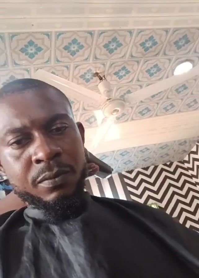 A man with a trimmed beard sits in a barber chair covered with a black cape. He looks at the camera while a barber begins to trim his hair from behind. The ceiling is decorated with blue, teal, and white tiles. A fan hangs from the ceiling. A wall with black and white zig-zag patterned wallpaper is visible in the background.