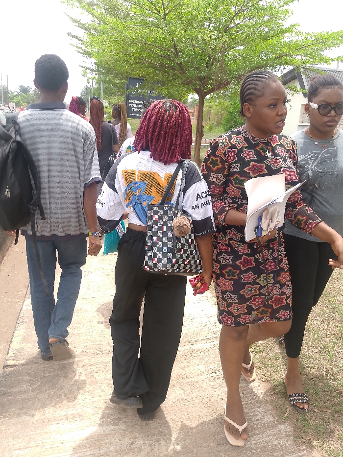 A daytime scene depicts a group of individuals walking outdoors on a paved pathway in Egbagu, Nigeria. From left to right: A male, seen from behind, wears a striped shirt, blue jeans, and a black backpack. Adjacent to him and slightly ahead, a female with long red dreadlocks wears a white crop top with a blue graphic and "ACM AN ARMY" text, black wide-leg pants, and carries a black and white checkered shoulder bag with a light brown pom-pom. To her right, a female with braided hair wears a dark, multi-colored floral pattern dress and light flip-flops; she holds an open document in her left hand, appearing to speak. Partially visible on the far right, a female wearing dark-framed glasses has a grey graphic t-shirt, black pants, and striped slides. Several other individuals are visible walking further in the background. Behind the walkers, a dark sign with white text is present, reading "NIGERIAN PENSION AND COMPANY," positioned below a lush green tree. The ground is a light-colored paved surface, with sparse grass visible to the right of the path.