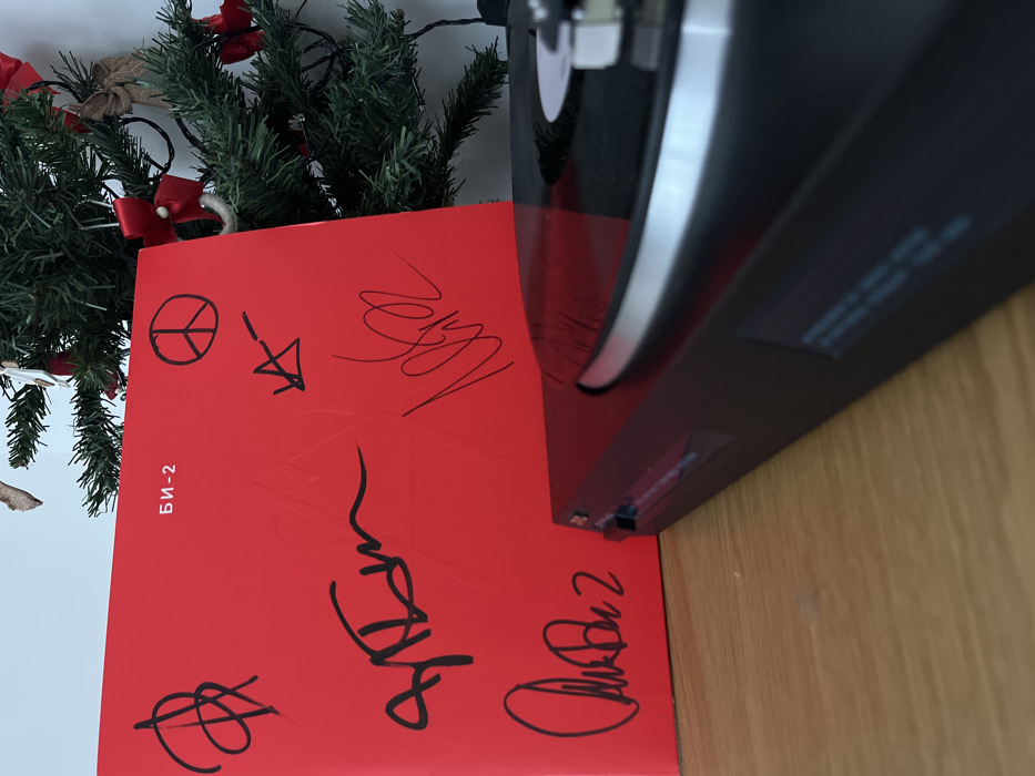 The scene is an indoor setting in Bečići, Montenegro, depicting a red vinyl record album cover and a black turntable with a record, situated on a light-colored wooden surface. The album cover, leaning against a white wall in the background, is solid red and displays "БИ-2" (BI-2) text at the top center. It is marked with several distinct black marker signatures and two hand-drawn symbols: a peace sign in the upper right quadrant and a stylized arrow or star in the middle right. A subtle, embossed geometric pattern is visible beneath the text and signatures on the red cover. To the right of the album cover, a portion of a green artificial Christmas tree, adorned with small red bows and a beige ribbon, is visible. In the foreground, a black turntable with a silver-rimmed platter holds a black vinyl record with a white center label. The tonearm with its cartridge is positioned on the record. Blue text, likely product information, is discernable on the front-right side panel of the turntable's base.