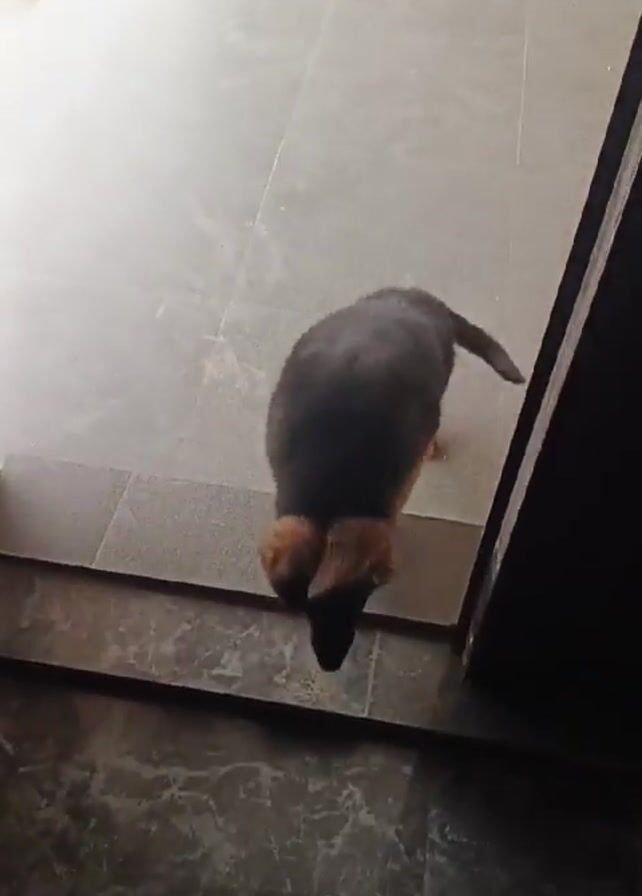 A puppy walks from the doorway into a room. The puppy is a German Shepherd, and it has a black back and brown legs and head. The floor is covered in grey tile. The puppy walks past the camera and towards a dark leather chair.