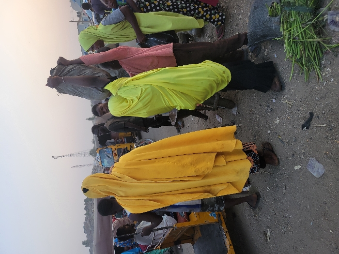 Several people stand in a dusty, outdoor setting. Women wear yellow and pink coverings. One woman’s floral patterned clothing is visible. In the background, vehicles and a communication tower can be seen. One woman stands beside a yellow three-wheeled vehicle. Green, long vegetables are in the foreground. The scene is captured at an angle, presenting a slightly tilted perspective.