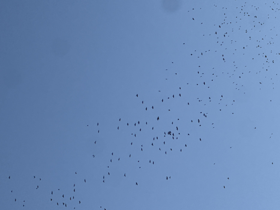 - "A multitude of small, dark birds fly across a clear, light blue sky" by FM-IdNfF2, licensed under CC BY 4.0