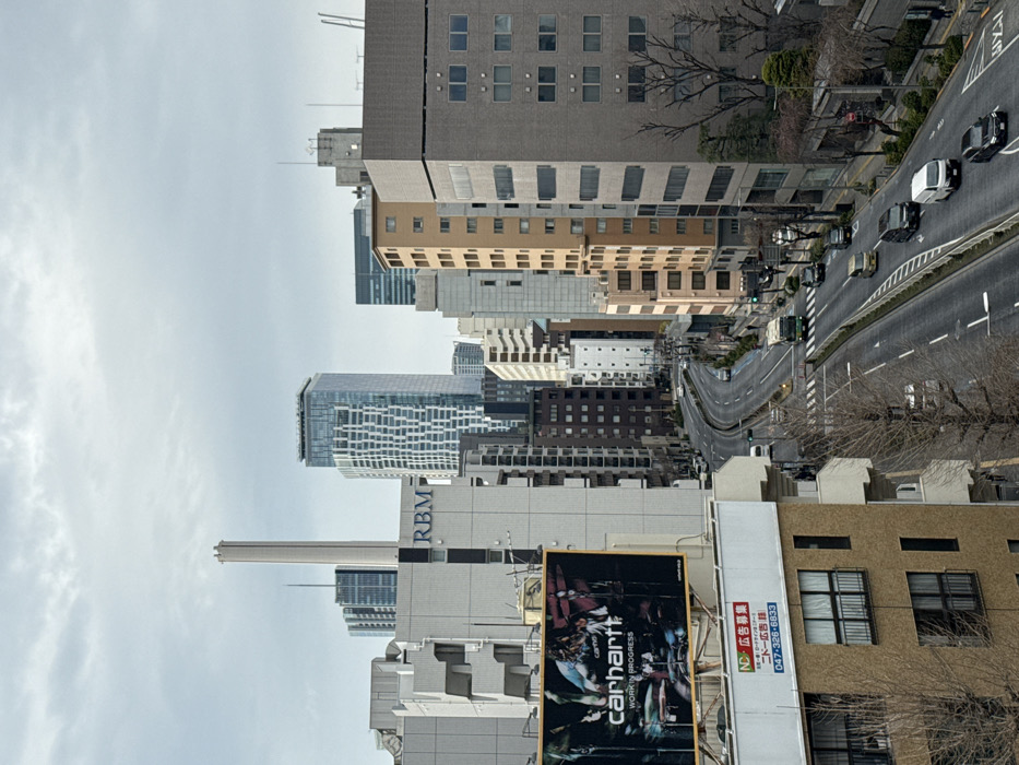 The image presents an elevated, wide-angle view of a bustling urban streetscape in Shibuya, Japan, under an overcast sky. The central feature is a wide, multi-lane asphalt road that curves through the midground, flanked by numerous multi-story buildings of varying architectural styles and colors. On the left side of the frame, a large billboard displays "carhartt WORK IN PROGRESS" text over dark, abstract imagery. Below it, a white sign with Japanese text and the phone number "047-326-6833" is visible on the façade of a beige building. Further back on the left, a light-colored building is marked with "RBM" near its roofline, behind which a tall, slender white cylindrical structure ascends prominently against the sky. In the distant background, a modern skyscraper with a distinctive wavy or textured glass facade stands out. The roadway features clearly painted white lane markings and pedestrian crosswalks. A central median, containing sparsely leaved deciduous trees, separates opposing traffic lanes. Multiple vehicles are actively traveling on the road, including passenger cars of various colors (black, white, beige), a white commercial van, and a green-and-white city bus moving away from the viewer. Traffic lights are operational, with at least two displaying green. Buildings lining the street exhibit diverse designs, ranging from older, blocky structures in shades of brown and grey to more contemporary, lighter-colored edifices. Bare deciduous trees and some evergreen shrubs are sparsely distributed along the sidewalks and within the median, suggesting a dormant season. A few indistinct pedestrian figures are observable on the sidewalks, primarily on the right side of the street. The sky is uniformly grey with visible cloud cover.