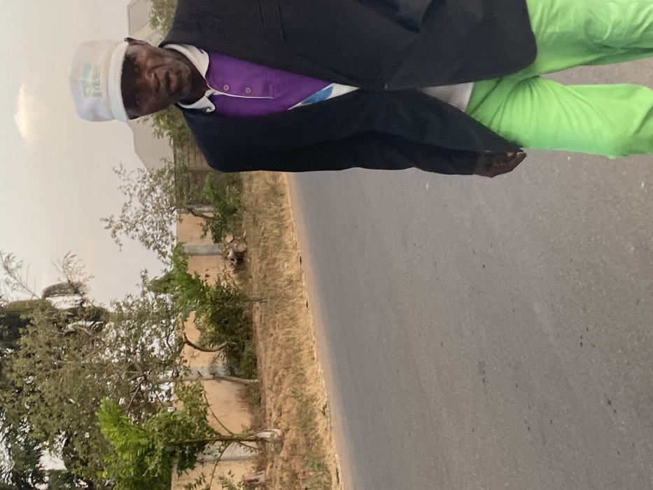 An outdoor scene in Du, Nigeria, depicts an older Black male subject positioned on the right side of a gray asphalt road, looking directly towards the viewer with his mouth slightly ajar. He wears a white baseball cap with a green and white logo, an unbuttoned dark blazer, a purple polo shirt with a white collar, and bright lime green pants. A light blue and white sash or piece of fabric is visible under his blazer. His right hand is visible at his side. The background features a low, light brown concrete wall or fence running parallel to the road. Behind the wall and along the roadside, sparse green and dry brown vegetation, including several trees of varying heights, is present. Patches of dry earth are visible between the road and the wall. In the distance, faint outlines of structures, possibly residential roofs, can be seen beyond the trees. The sky is a pale, hazy gray, suggesting either early morning or late afternoon light. The paved road shows minor surface imperfections.