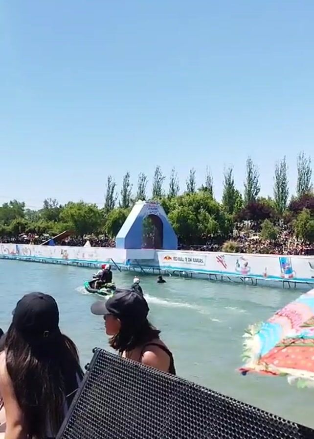 water-based event from the perspective of someone standing near a crowd of people, overlooking the event. There is a lagoon with an obstacle course set up, featuring a large blue and white archway in the background that includes a Red Bull logo. The lagoon has individuals participating in the event on watercrafts. There are crowds of spectators along the sides of the lagoon watching the watercrafts. The sky is clear and blue. The camera pans back to show the crowd of people, mainly in the back, wearing casual clothing.