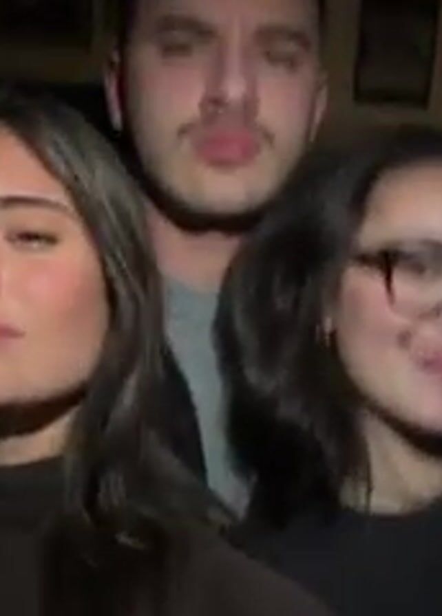 Three people are visible in a dimly lit setting. Two women are in the foreground and a man is positioned behind them. The woman on the left has long brown hair and is wearing a dark top. She purses her lips slightly. The woman on the right wears glasses and a dark top. She briefly sticks her tongue out. The man in the back has short dark hair and a mustache. Someone's hand briefly appears in the frame, pointing down. The background is out of focus, but framed artwork is visible. All three people are looking towards the camera.