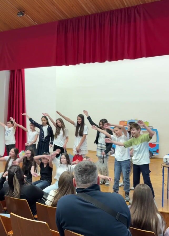 A group of children are performing on a stage in a large room. They are singing and dancing. The children on stage are wearing a variety of casual clothes. In front of the stage, people are sitting in chairs and watching the performance. The stage has a red curtain backdrop and some props, including a blue car cutout. The lighting in the room is bright.