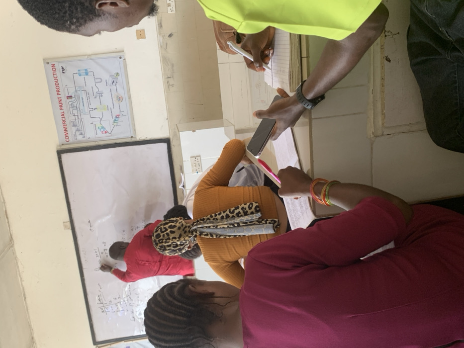 The scene depicts an interior view of an educational institution, likely a university, polytechnic, or vocational training center, located in Calabar, Nigeria. The environment is a classroom or laboratory during an instructional session. In the center-left background, a dark-skinned male instructor, wearing a red long-sleeved shirt, stands with his back to the camera, actively writing mathematical equations and calculations on a white dry-erase board with his right hand. Visible text on the board includes "Q = (3x+1)/4" and "1st quartile." To the right of the whiteboard, a poster titled "COMMERCIAL PAINT PRODUCTION" displays a detailed process flow diagram with the "FMP" logo. In the foreground, a dark-skinned female student, facing away from the camera, is positioned on the left. She wears a fuchsia-colored short-sleeved top, and her hair is styled in cornrows. Her right wrist is adorned with multiple colorful bangles, and she holds a red pen poised over an open notebook on a white-tiled desk. Immediately behind her, another dark-skinned female student is visible from the back, wearing a ribbed mustard yellow long-sleeved top and a leopard print headwrap with its ends draped down her back. She is seated, facing the whiteboard. On the right side of the foreground, a dark-skinned male student, partially visible, wears a lime green short-sleeved top. His right hand holds a white pen, writing in an open notebook resting on the same tiled desk. His left hand holds a dark-colored smartphone horizontally, and a black digital watch is visible on his left wrist. A brown bag is partially visible to his right on the desk. The classroom features light-colored walls, a white ceiling, and white-tiled benches or desks along the back wall, equipped with several white electrical outlets. The students appear to be engaged in note-taking or problem-solving during the instruction.