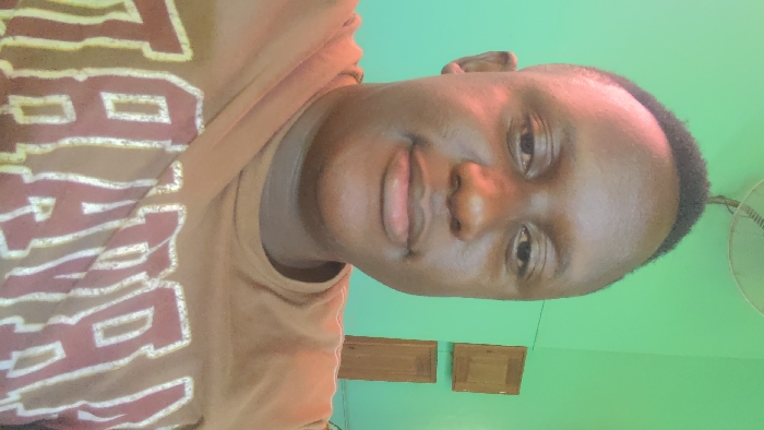 A man with dark skin and short, dark hair poses for a selfie. He wears a tan t-shirt with a large, vintage-style graphic design in brown and off-white. The background features a mint-green wall with a few framed objects. A portion of a white ceiling fan is visible in the upper right corner. The man smiles slightly. The photo is slightly tilted to the side.