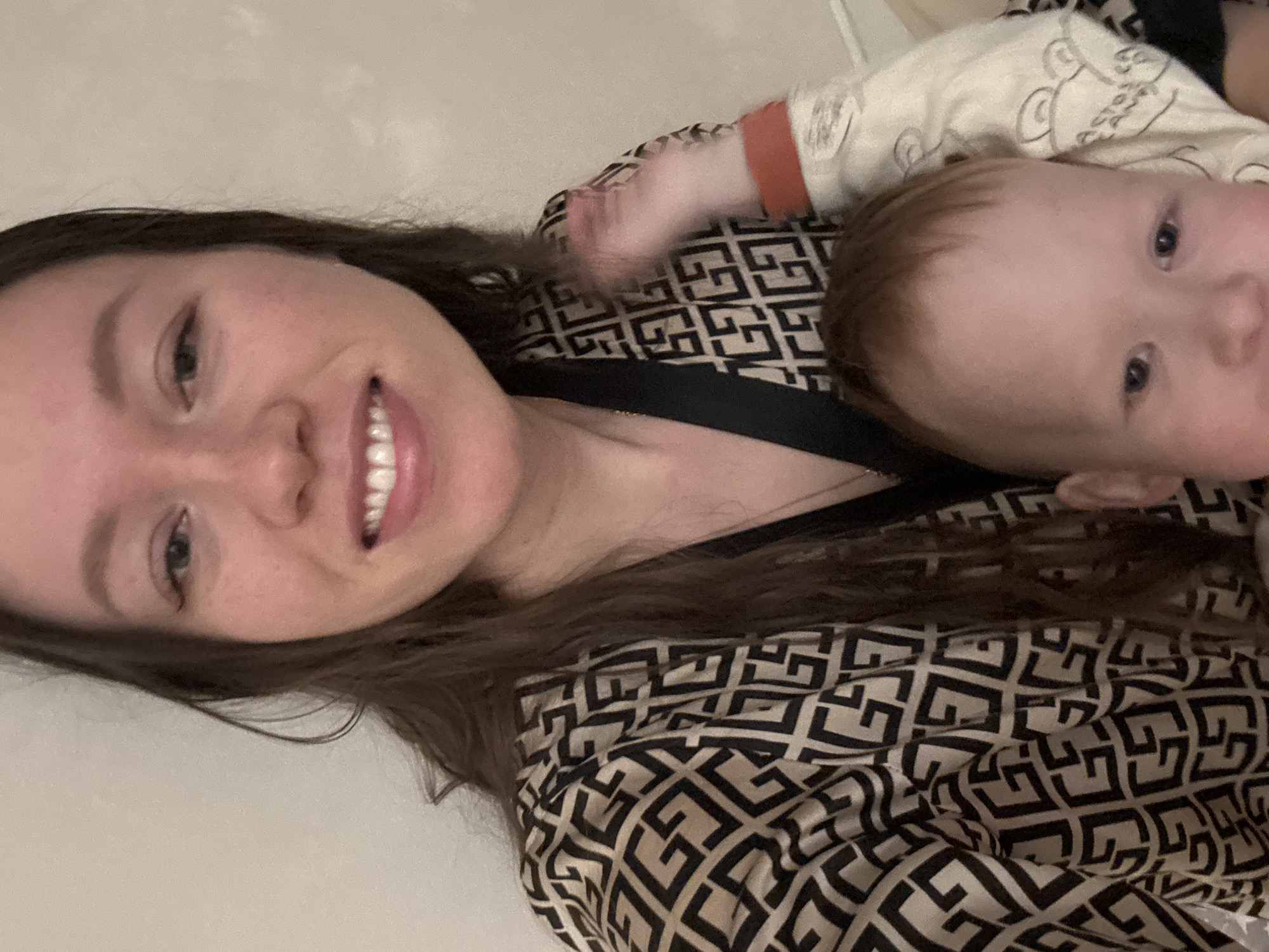 An indoor, waist-up photograph depicts an adult female holding an infant, both looking directly at the camera. The adult female, positioned in the upper frame, has long dark brown hair, fair skin, and is smiling with her teeth visible. She is wearing a robe or top with a black-on-beige geometric pattern resembling interlocking 'G' shapes, featuring a dark black trim along the neckline. Below her, an infant with light reddish-brown hair is partially visible in the lower frame, wearing a light-colored garment with an orange cuff on the left arm. The infant's left hand is raised near the adult's shoulder. The background consists of a plain, light-colored wall. The scene is located in the city of Ферма, Russia.