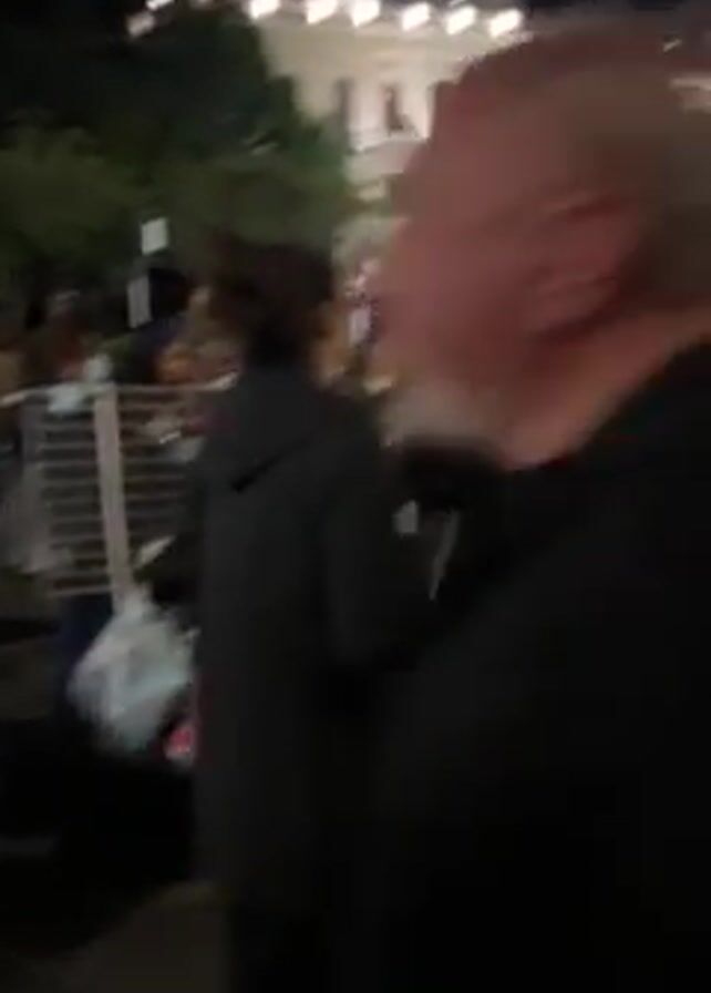 crowded public space at night. People are gathered in what appears to be a town square, illuminated by streetlights and the lights of surrounding buildings. Some individuals are standing around tables, possibly selling items. In the background, there is a building with a statue in front of it. The crowd is dense, and people are walking and talking. The camera moves through the crowd, offering different perspectives of the scene.