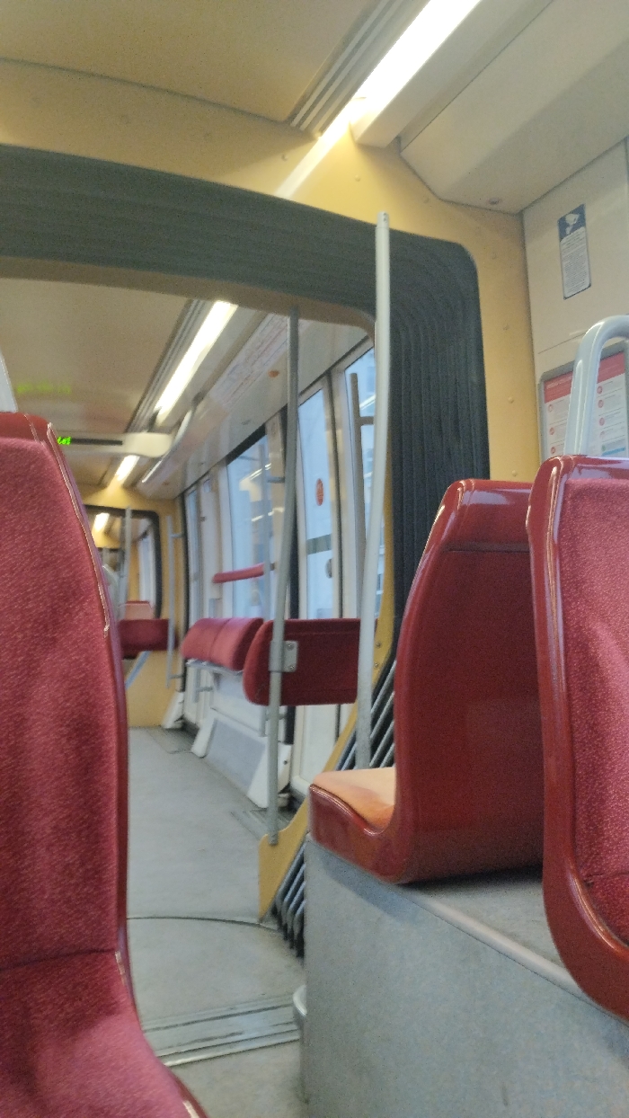 - "The image displays the interior of an empty public transportation vehicle, identified as a tram or light rail train, situated in Hoenheim, France" by FM-uMUqt2, licensed under CC BY 4.0