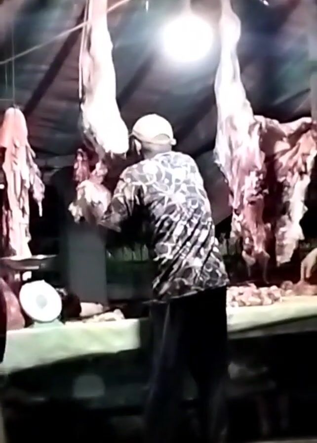 A man wearing a printed shirt and a light-colored cap stands behind a table, working with meat. Several large pieces of meat hang from above. A scale is visible on the table. A second person stands to the left, wearing a dark jacket. A single bright light illuminates the scene. The environment appears to be a butcher shop or market stall.