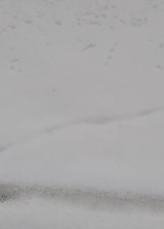 The camera pans upwards from a low angle. The foreground is covered with snow, with a line of dark debris at the bottom. The view rises to reveal a tree trunk standing in the middle of a snow-covered yard. A gray concrete fence runs along the back of the yard. Bare tree branches are visible against the sky. A building with windows is partially visible behind the fence. It is winter.