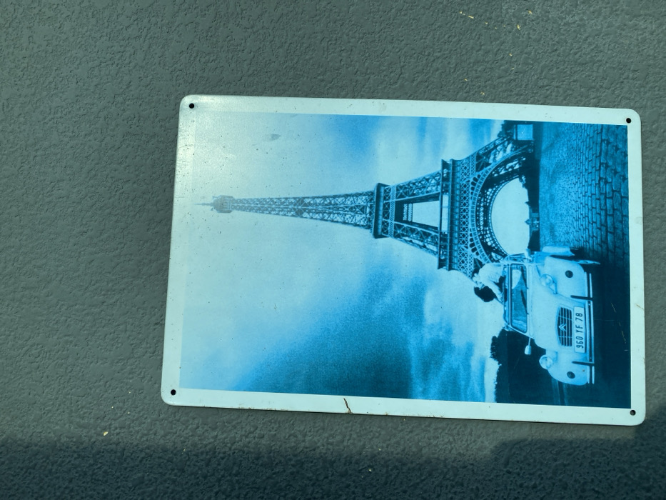 A rectangular metal sign displays a blue-toned photograph of the Eiffel Tower in Paris