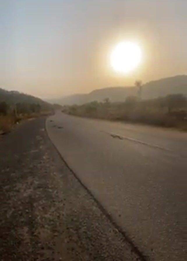 The video begins with a shot of a road leading away from the camera toward mountains on the horizon, with the sun high in the sky above them. The camera is positioned on the side of the road, and moves forward slightly. A man wearing a light blue outfit walks past the camera on the road. A tire and some kind of leafy vegetation are lying on the road. The man is walking away from the camera.