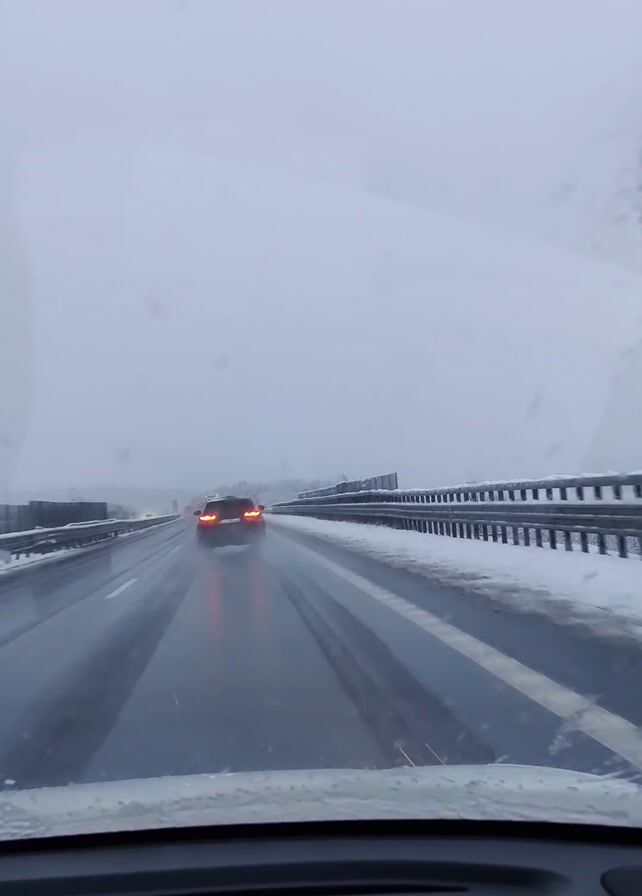 car driving on a highway during snowy weather. The road is wet, and the windshield wipers are in use. There is a car ahead of the camera car, and a highway overpass to the right. A billboard is visible on the right, but the words are illegible due to the weather conditions. The video appears to be shot from inside the car.