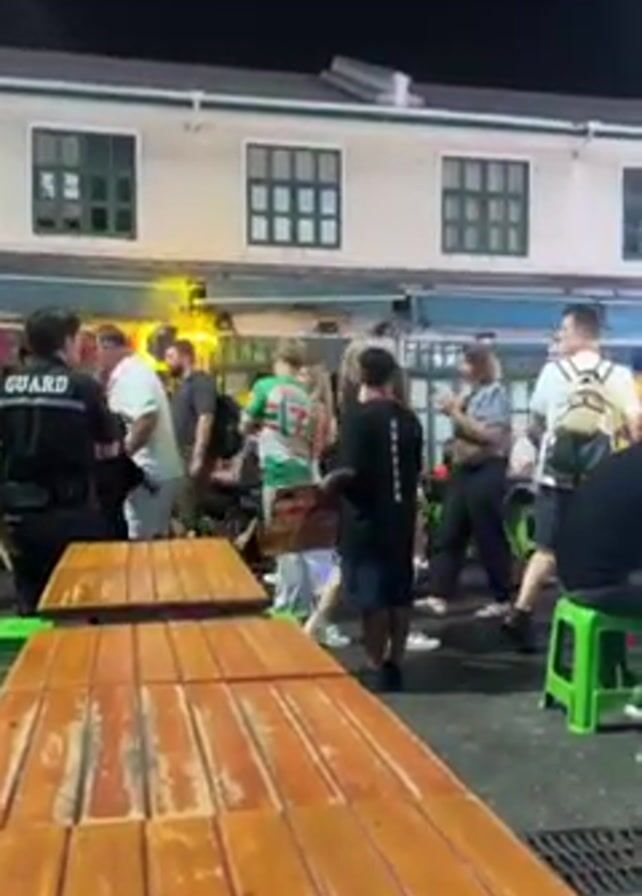 busy street scene at night, likely in a tourist area, with many people walking around and others sitting at tables. The tables are made of wood and accompanied by small, green plastic stools. Some people are sitting and talking at these tables. There appears to be a guard or security person standing near a crowd. The buildings in the background are mostly low-rise with distinctive windows. There's some music playing, adding to the lively atmosphere. The lighting is provided by street lamps and lights from nearby businesses. The overall scene suggests a casual, social gathering or market-like environment.