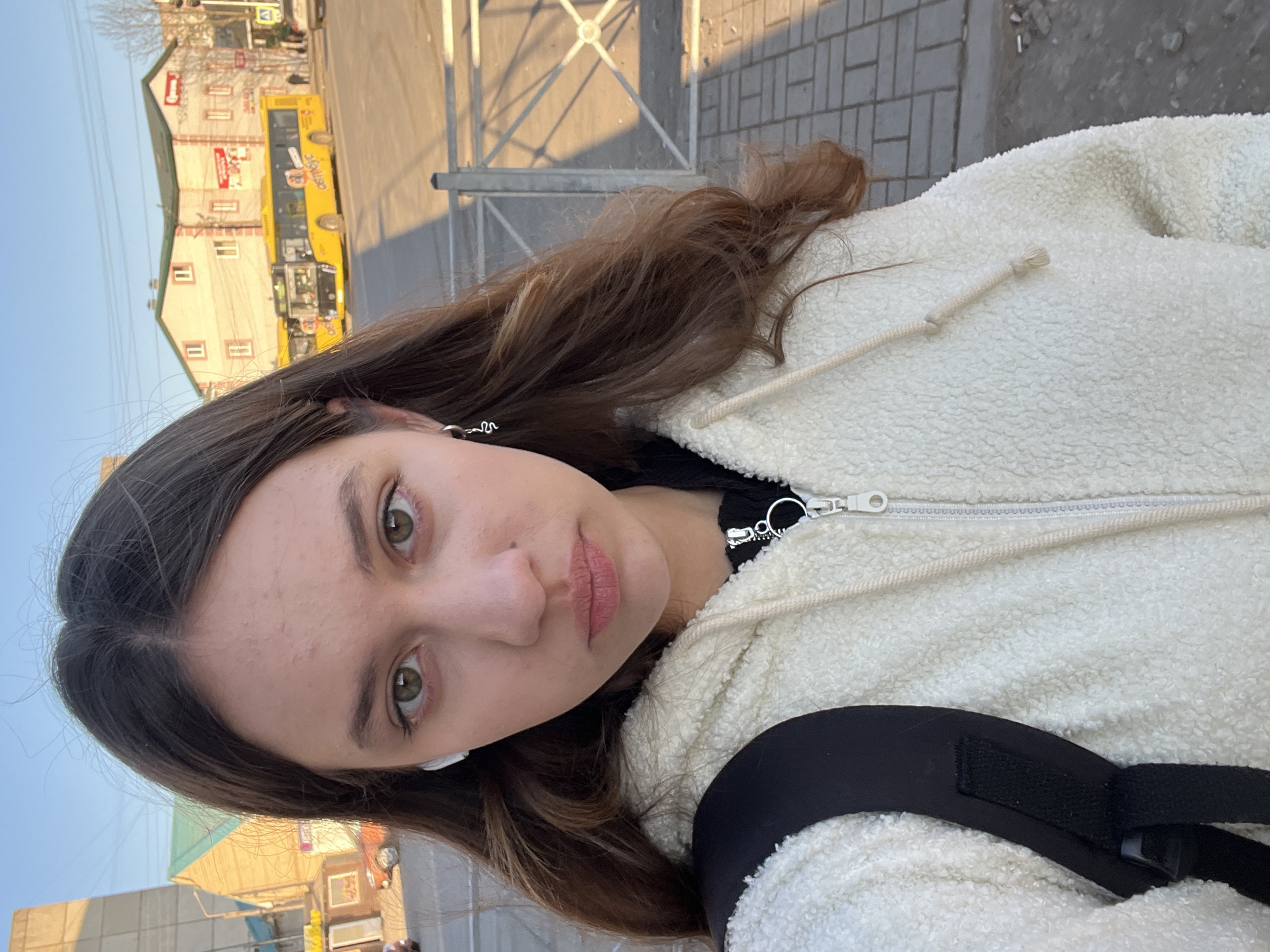 A young woman with long brown hair is taking a selfie outside in Ново-Никольское, Russia. She is wearing a white, fuzzy zip-up hoodie with a black backpack strap visible over her shoulder. A white earbud is visible in her left ear. In the background, there is a street with buildings and a yellow bus. A metal railing runs along the sidewalk. The sky is pale blue.