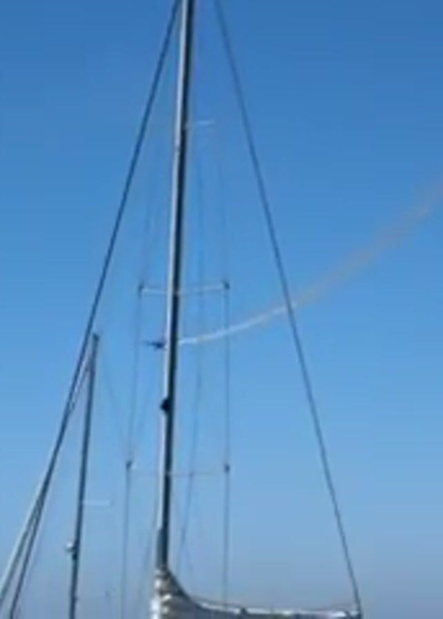 sailboat on water under a clear blue sky. An airplane is visible in the sky leaving a contrail. The sailboat has a tall mast and several people on deck. In the distance, a pier and buildings are visible, as well as other boats.