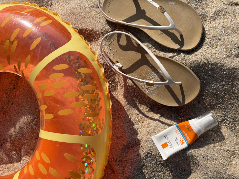 A forensic examination of the image reveals a still life arrangement of beach paraphernalia laid upon coarse, light brown sand, consistent with a beach environment in Kamala, Thailand. The primary subjects include a partially visible, orange translucent inflatable swimming ring, designed with yellow segments and containing reflective golden glitter, positioned in the upper-left quadrant. To its immediate right lies a pair of beige-colored flip-flops featuring slender white straps. In the lower-left portion of the frame, a white tube of "LA ROCHE-POSAY ANTHELIOS UVmune 400 SPF 50+" sunscreen is oriented on its side, with its pump dispenser cap facing away from the viewer. Strong overhead illumination casts distinct shadows from all objects onto the sand. No individuals, actions, or interactions are present in the scene.