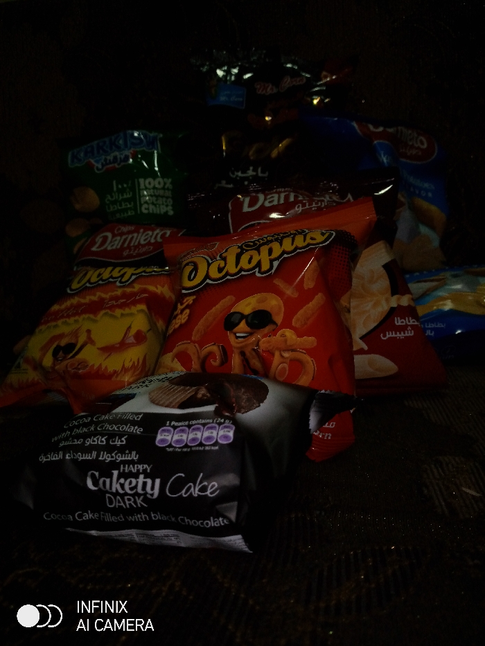 A stack of snacks includes "Karkis," "Darnieto," "Octopus" chips, and "Cakety Cake Dark