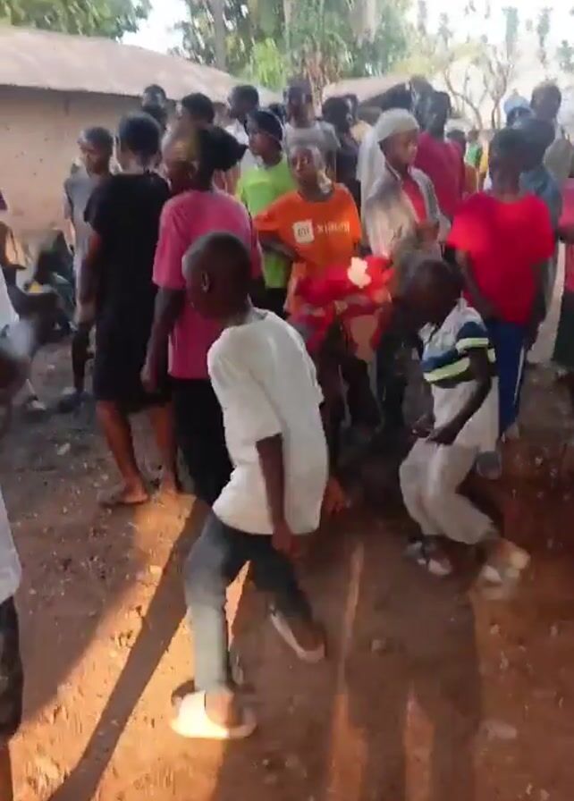 crowd of people, mostly children, gathered in what appears to be a dusty, outdoor area. Some individuals are dancing, notably a child in a white and blue striped shirt who is vigorously performing moves low to the ground. The crowd is dressed in a variety of casual clothes. In the background, there's a simple building with a metal roof, and trees are visible. The camera moves slightly, capturing the scene from the perspective of someone within the crowd. The sound of drumming accompanies the scene.