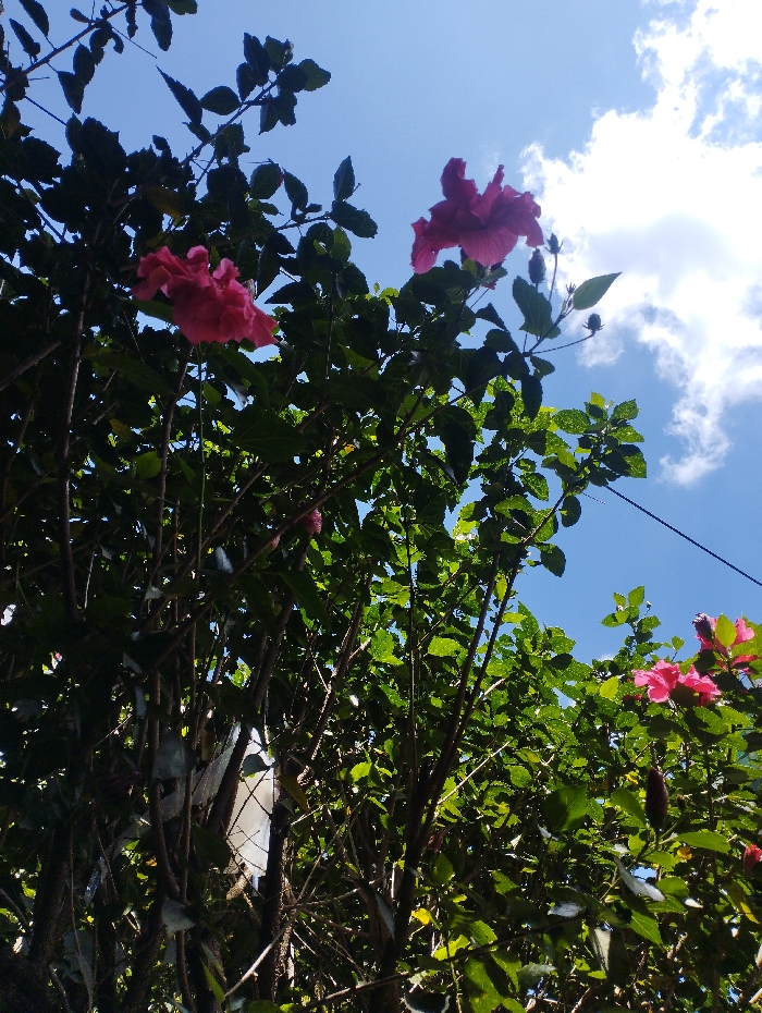 - "The image displays a dense flowering shrub, likely a hibiscus, viewed from a low angle against a clear blue sky interspersed with white cumulus clouds" by FM-YRmUt1, licensed under CC BY 4.0