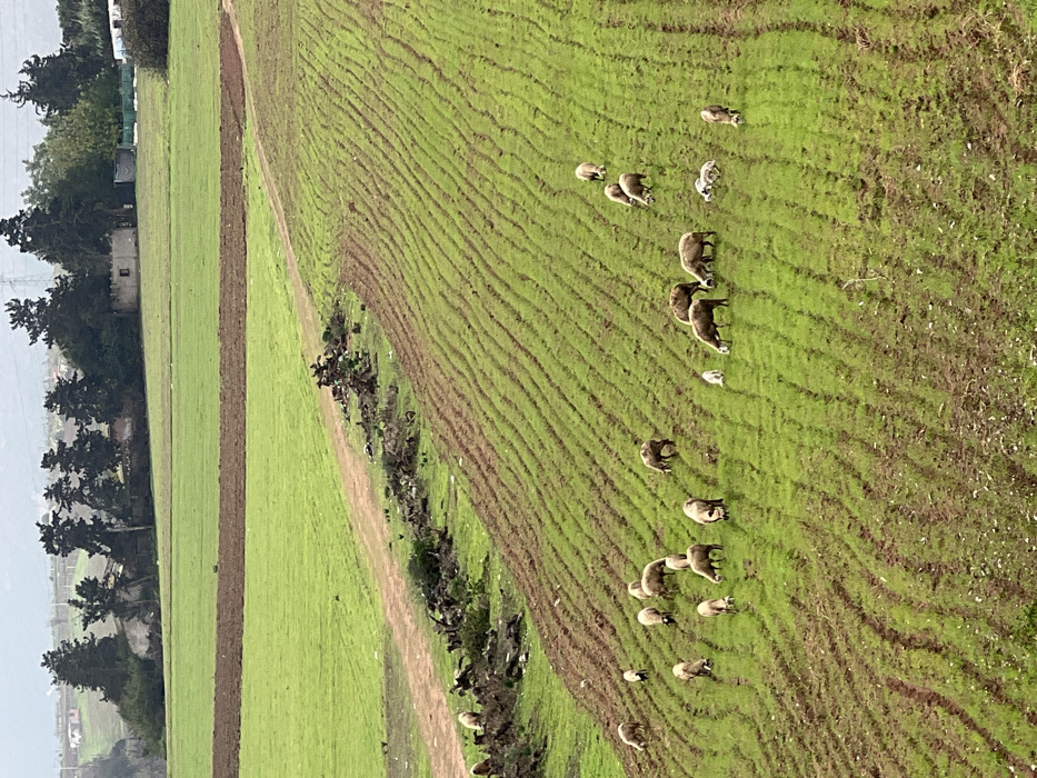 The image displays an agricultural landscape situated within the vicinity of Salé, Morocco, under an overcast sky. In the foreground and midground, approximately 25 sheep and several lambs are observed grazing on a cultivated field composed of parallel rows of nascent green crops. Sections of bare, dark soil are visible between the rows and in the lower left. A dirt track runs diagonally across the midground, separating a parcel of land containing scattered refuse and debris from another expansive green field. The background features a linear arrangement of dark evergreen trees, partially obscuring distant structures, including a light-colored building with a discernible window opening. Faint outlines of distant hills and a power line pylon are visible in the far background. No human subjects are present.