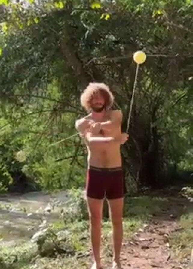 A man with curly brown hair and a beard juggles two yellow balls attached to strings in a wooded area near a stream. He is shirtless and wearing maroon shorts. The camera angle looks up at the man as he performs his juggling routine. Trees surround him, and sunlight filters through the leaves.