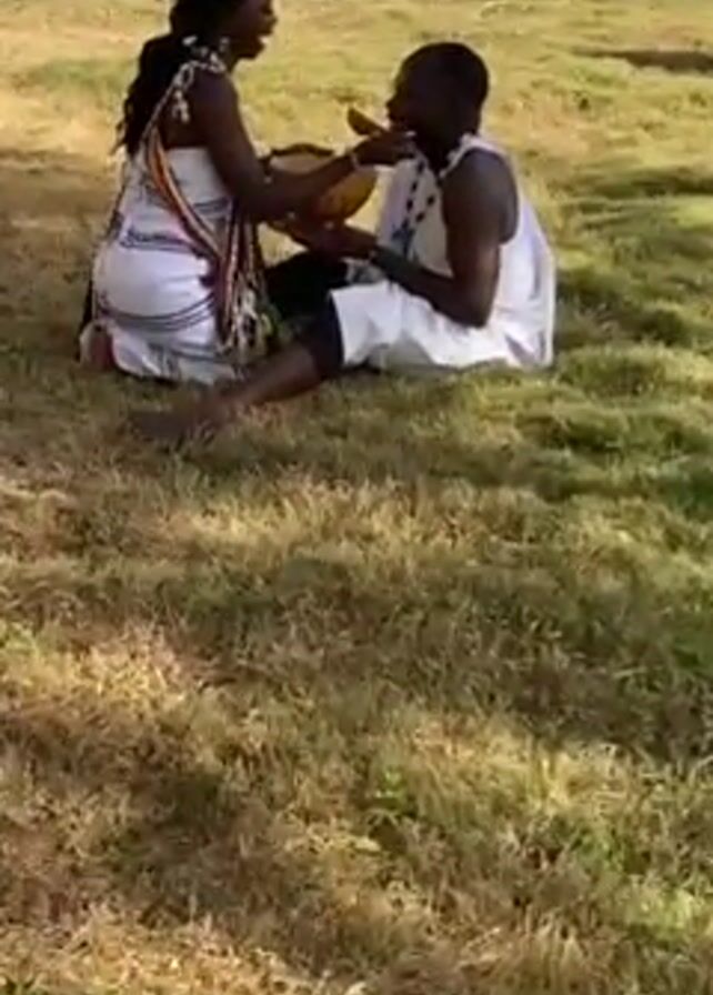 In a sunlit outdoor setting, a couple, presumably a man and a woman, are seated on a grassy patch, with the woman feeding the man from a bowl or container. Both are attired in what appears to be traditional or cultural clothing. The woman is kneeling, while the man is seated beside her. She has a dark complexion and has a decorative headband on her head, with the man also having a dark complexion and what looks like a beaded necklace. The background suggests a park or open area with sparse trees and a building or structure in the distance.