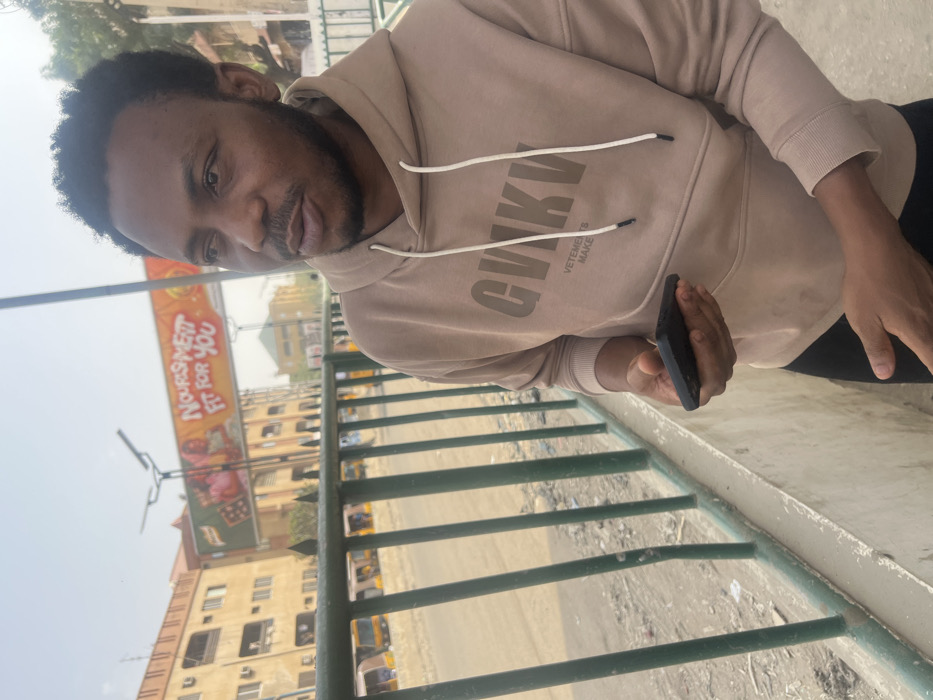 A man with short black hair and a beard is holding a black phone. He is wearing a beige hoodie with white drawstrings and dark lettering. He's standing near a green metal railing, with buildings and vehicles visible in the background on a sunny day. A billboard with food advertisements is also visible.