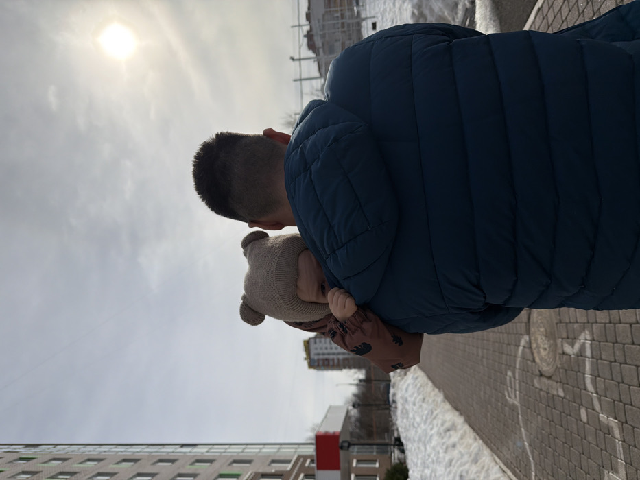 The scene depicts an adult, viewed from behind, carrying a child on their left shoulder. The adult wears a dark blue puffer jacket with a hood and has short, dark hair with shaved sides. The child is attired in a light brown knitted hat with two ear-like protrusions and a brown padded suit patterned with dark shapes; its left eye and part of its face are visible peering over the adult's shoulder, with a small hand resting on the adult's jacket. They stand on a paved pathway composed of grey interlocking bricks, which exhibits faint white chalk markings and circular manhole covers. A bank of snow lines the left edge of the path. To the immediate left, a tall, multi-story residential building with light brown brickwork and intermittent green facade panels is visible. Further in the background, another multi-story building with a lighter facade is present. The sky is largely overcast, with the sun appearing as a bright, diffused disc in the upper right quadrant of the image. The setting is an urban residential area in Izhevsk, Russia, consistent with winter or early spring conditions.