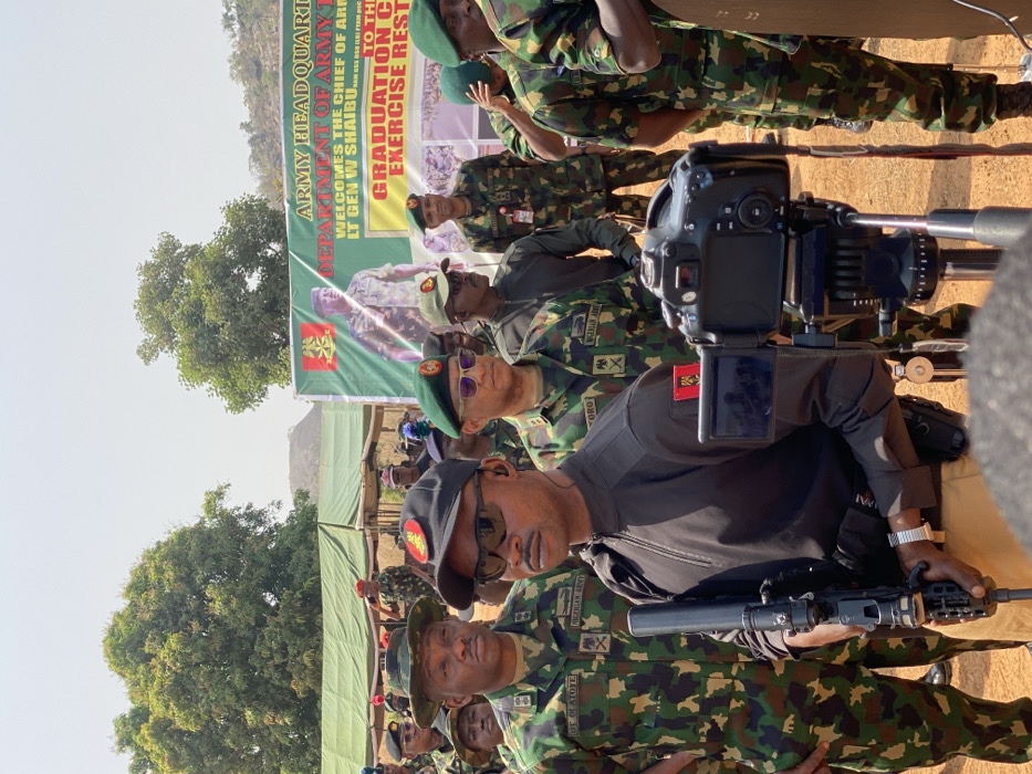 The image depicts an outdoor military event taking place in Kachia, Nigeria, on dry, sandy ground under a clear, bright sky