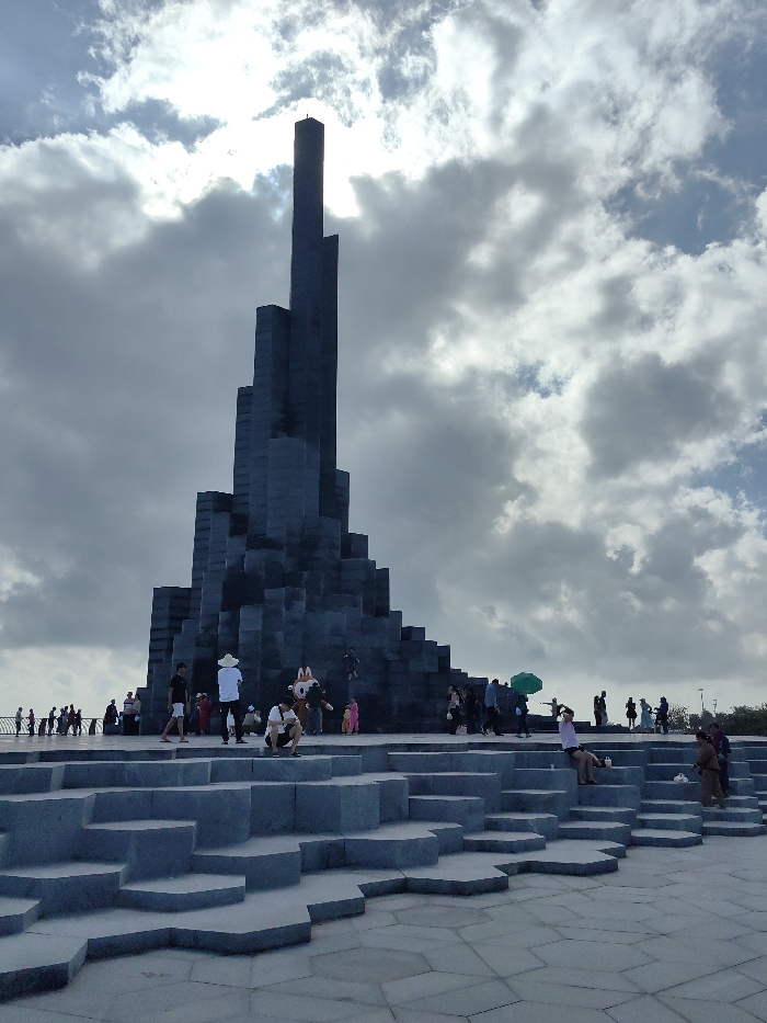 A tall, modern monument towers under a cloudy sky, resembling stacked geometric blocks. The monument is dark in color, contrasting with the brighter clouds behind it. A tiered platform extends out from the monument, populated with people. Some are walking, sitting, or taking pictures. The area appears to be a public space or park, designed for gathering and appreciation of the structure.