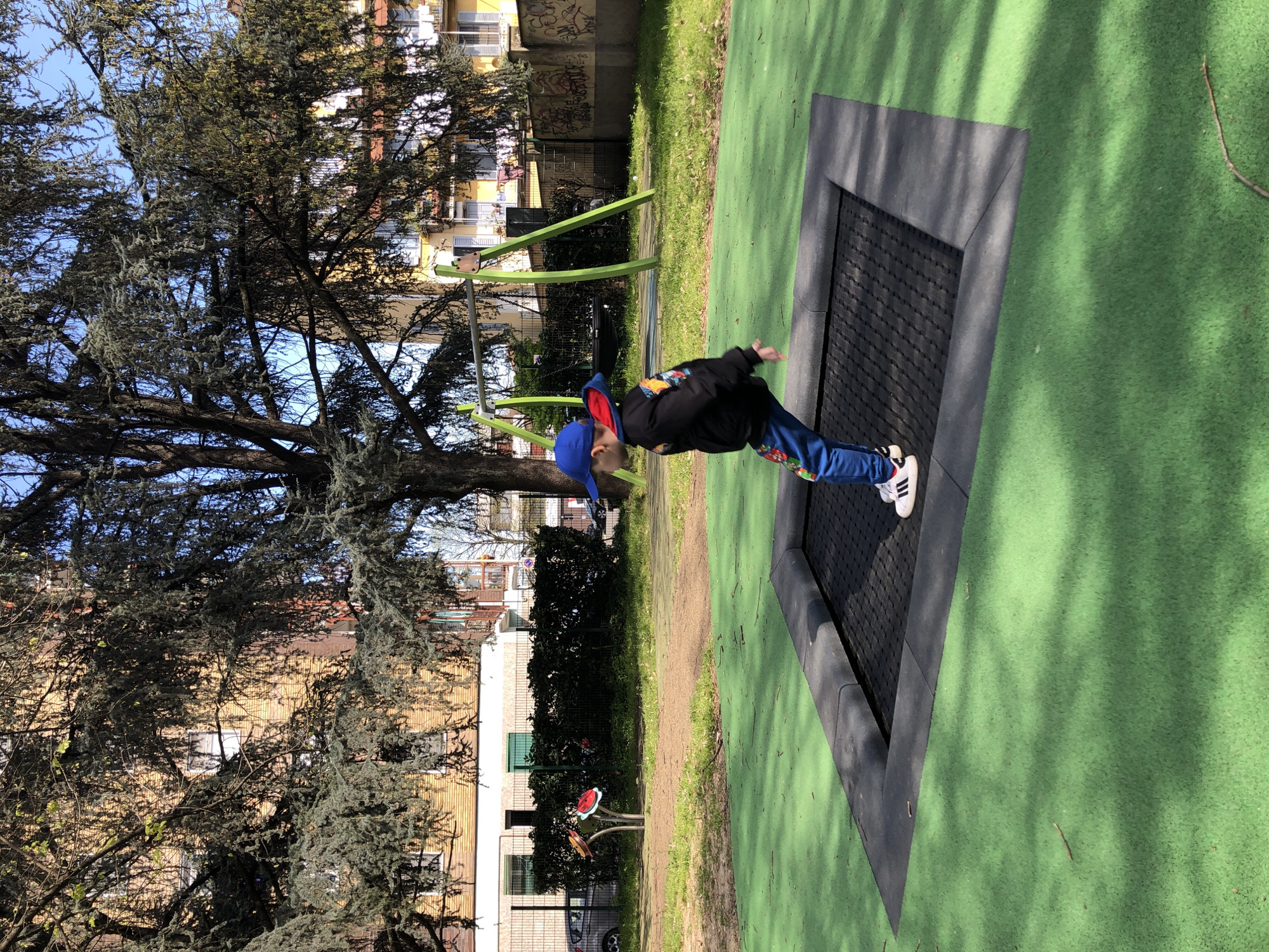 A young male child, wearing a blue baseball cap, a black hooded jacket with colorful patches, blue patterned pants, and white Adidas sneakers, is captured mid-air during a jump on an in-ground trampoline. The trampoline features a black mat and a dark gray rubber safety border, set into a bright green artificial turf surface. The immediate surroundings consist of the green artificial turf, transitioning to a patch of dirt and sparse grass further back. To the left, a "flower"-shaped spring rider with red and orange elements is visible. In the mid-ground, a set of green-framed swings with a black seat is present. The playground area is delineated by a chain-link fence topped with a dense green hedge. Beyond the fence, a paved area or street contains a parked dark gray hatchback and other partially visible vehicles. The background features several multi-story residential buildings. On the left, a brick-colored building with visible windows and closed green shutters is partially obscured by trees. On the right, a yellow building with white balconies, some displaying hanging laundry, is visible beneath more trees. Large trees with sparse green-blue foliage dominate the upper background, casting shadows across the scene. A wall with graffiti is visible on the far right. The sky is clear blue, indicating bright daylight. This scene is located within the city of San Giuliano Milanese, Italy.