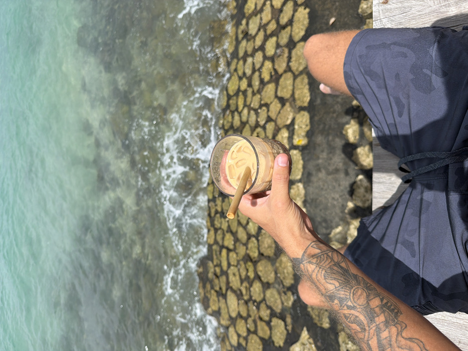 An overhead shot captures a tattooed arm holding a glass of iced coffee with a straw. The setting appears to be a seaside location, with turquoise water visible to the left and a stone pathway bordering the water's edge. The person is wearing gray shorts, seated on what looks like a wooden dock or bench.