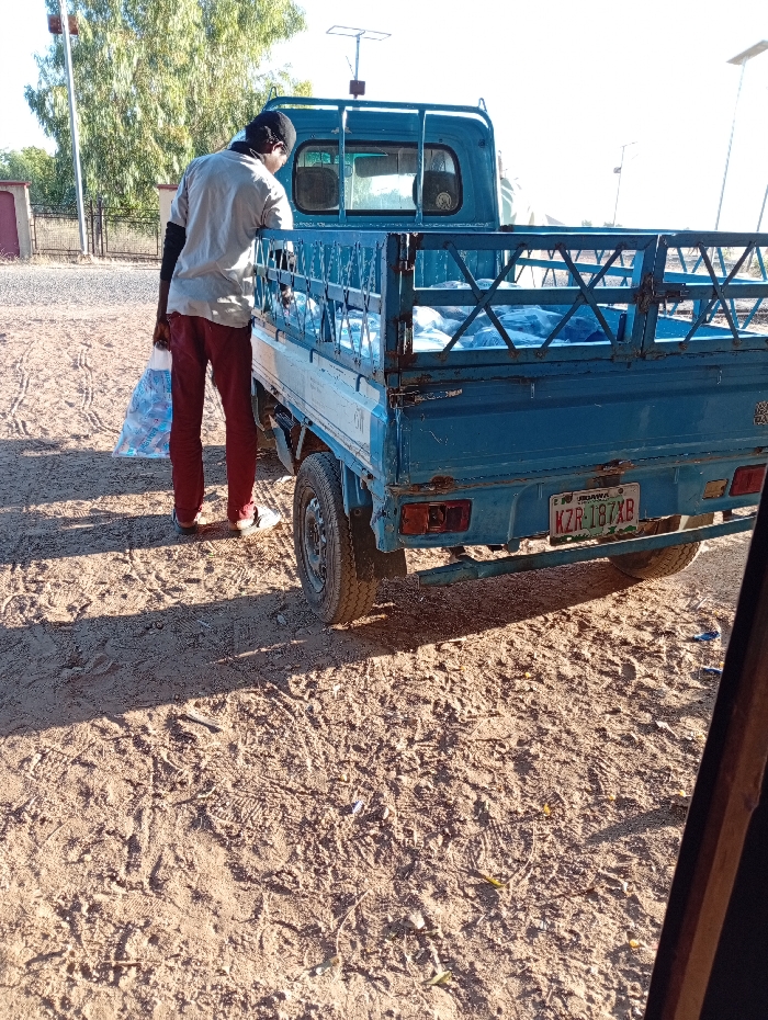 A person loads a blue truck with a white bag containing blue water bottles. The vehicle is small and weathered, with a cross-hatched cage surrounding the truck bed. The license plate reads "KZR 187 XB". The ground is dry and sandy, scattered with debris. The scene is bathed in sunlight, casting shadows. A few buildings and trees are visible in the background. A dark object is located at the bottom right corner of the image.