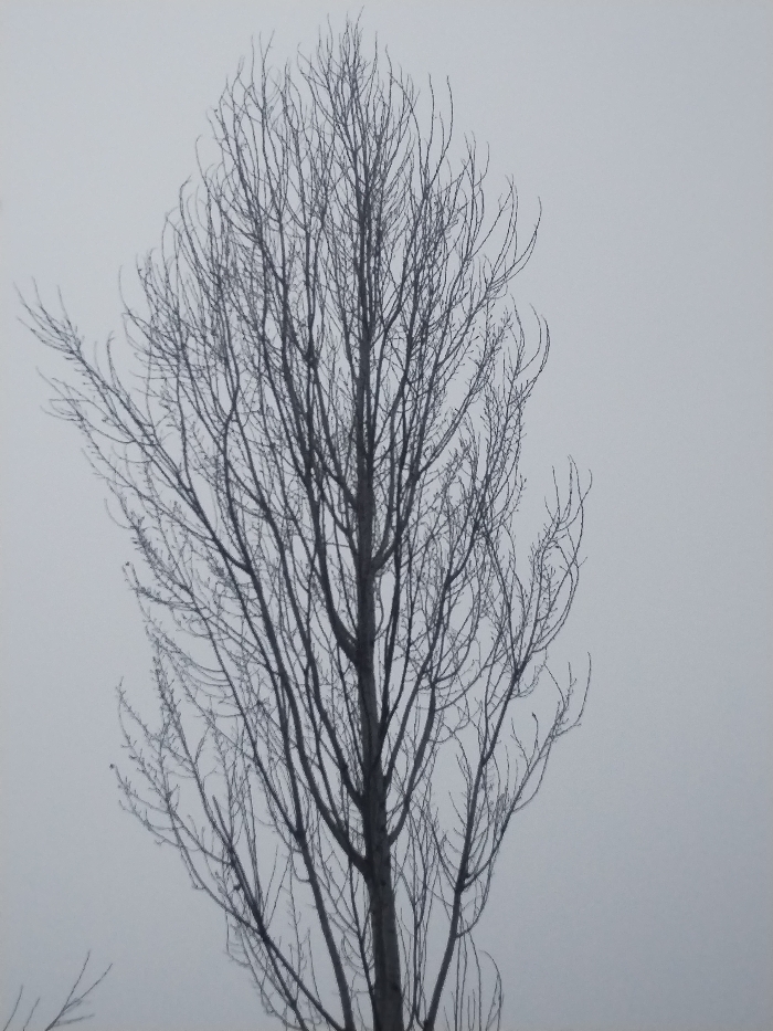 A tall, leafless tree dominates the scene against a monochrome, overcast sky. The slender trunk branches out into numerous delicate, bare limbs. The tree's overall form is somewhat oval, tapering to a point at the top. The stark contrast between the dark branches and the light gray sky creates a somber and minimalist aesthetic.