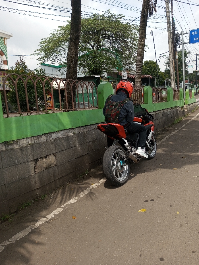 The image depicts a red sport motorcycle parked or stopped on the side of an asphalt road in Khajuripada, India, alongside a green-painted concrete wall. A single individual is seated on the motorcycle, viewed from the rear left, wearing a red full-face helmet, a dark jacket, a camouflage-patterned backpack, black pants, and white athletic shoes. The motorcycle features silver-colored alloy wheels, a visible exhaust pipe, and a blue accent on the rear wheel hub. The road surface is asphalt, with a faded white line marking its edge parallel to the wall. Scattered leaves and dark spots are visible on the road. The concrete wall is roughly waist-high, topped with a brown metal fence composed of arched segments. Behind the fence, various trees and green foliage are present, including a large tree with dense green leaves and a tall, slender tree with sparse foliage. In the background, to the far left, a light-colored building with ornate details (possibly a mosque) is partially visible. Multiple utility poles with numerous overhead wires extend along the right side of the road, and a blue street sign with white text, partially obscured but showing "Anda" and "Kawa," is attached to one of the poles. The sky is overcast. Shadows of leaves and infrastructure are cast onto the road surface.