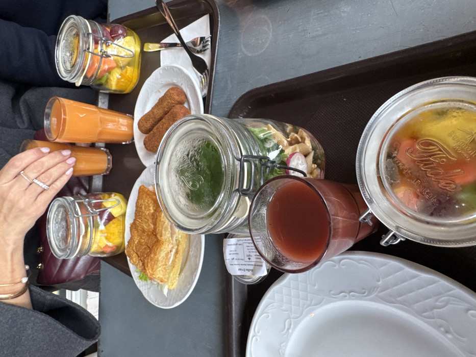 The image presents an overhead view of a meal for at least two individuals, arranged on two dark brown serving trays atop a dark, possibly metallic, table surface exhibiting faint circular residue marks. The setting is an indoor dining establishment; the specific city and country are unknown. On the upper tray, positioned from left to right: a lidded glass jar contains mixed fruit; a white plate holds a savory puff pastry sandwich served on a bed of lettuce; two tall glasses contain an orange-colored juice; another lidded glass jar contains mixed fruit; and a small white plate holds two elongated, fried croquettes. A wrapped set of cutlery (fork and knife) accompanies the croquettes. A person's left hand, featuring light skin, manicured nails, and two rings (one diamond band, one plain band), is observed reaching for one of the orange juice glasses. A second individual is partially visible in the blurry background. On the lower tray, from left to right: a large white plate with an embossed rim is present; a glass contains a red-colored beverage; a lidded glass jar, bearing the embossed name "Fido" on its lid, contains a layered salad with green leaves, radish slices, and croutons; and another lidded glass jar, also embossed with "Fido" and "made in Italy," contains mixed fruit. A small, clear plastic container with a paper insert labeled "Bollo Ervan" is situated near the red beverage.