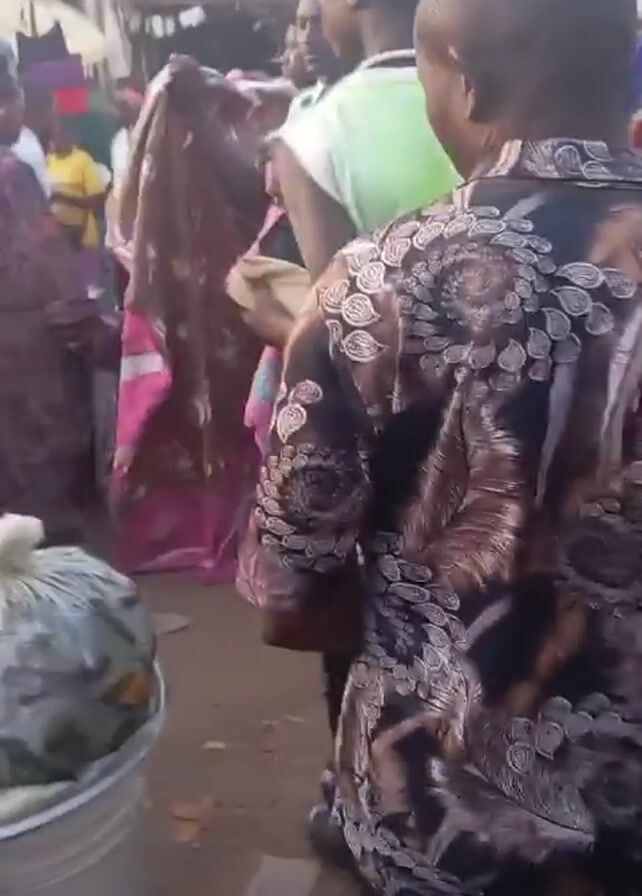 crowded outdoor scene, possibly a market or gathering, with people moving around in close proximity. The camera follows a person wearing a dark shirt with a distinctive white and brown pattern on the back. Other individuals can be seen around them, including someone in a bright green top, a person with a colorful patterned dress, and others carrying items. The environment appears to be a busy and somewhat chaotic outdoor setting.