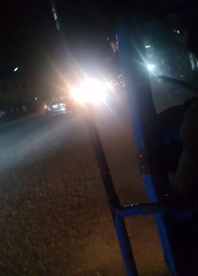 The video depicts a night scene from the perspective of someone riding in a vehicle, likely a tricycle or similar open-air transport