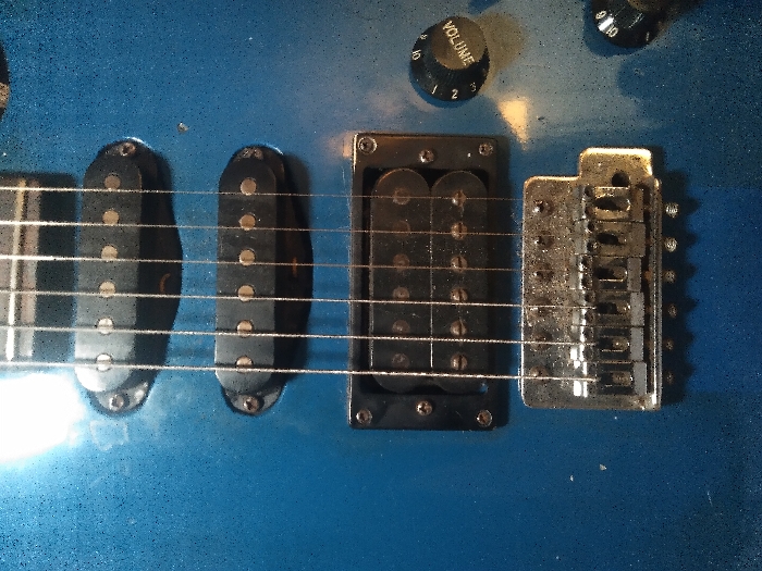 - "The image provides a detailed, vertical close-up of the body of a metallic blue electric guitar" by FM-f4dh13, licensed under CC BY 4.0