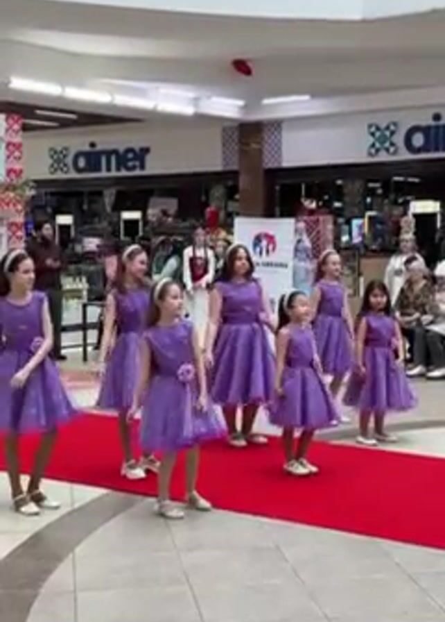 A group of nine young girls, possibly a dance troupe, are performing on a red carpet in what appears to be a shopping mall. They are all dressed in matching purple dresses with tulle skirts and a floral detail at the waist, with their hair either down or styled in headbands. They move in unison, twirling and stepping to the music. The background includes mall storefronts with visible logos like "aimer", bystanders watching the performance, and decorative elements. The architecture of the mall is modern, with a multi-tiered design and skylights.