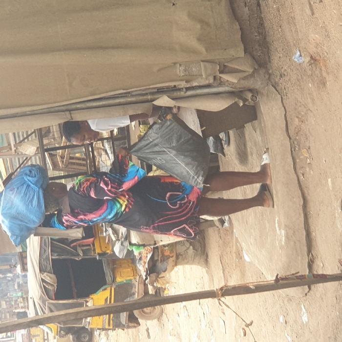 The image captures an outdoor market scene in Onitsha, Nigeria, characterized by dusty, unpaved ground and informal structures. An adult female, positioned centrally and in profile facing right, wears a black dress adorned with vibrant, multi-colored patterns and mismatched slide sandals. She balances a light-blue bundled bag on her head and holds a black plastic bag in her left hand, extending it towards the right. To her immediate right, a younger individual or smaller adult, wearing a white t-shirt, is partially visible, peeking from behind a large, light-brown canvas tarp that forms part of a makeshift stall or structure. This individual appears to be engaging with the primary female. In the background, a yellow and black Keke Napep (tricycle taxi) is parked, and various corrugated metal structures and general clutter are present. A metal pole with tied string stands in the left foreground.