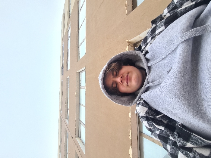A young person in a gray hoodie with the hood up and a black and white checkered jacket is posing outside. The person has short brown hair and their eyes are closed. Behind the person is a beige building with rows of windows. The sky is light blue. The photo appears to have been taken from a low angle, looking upwards.