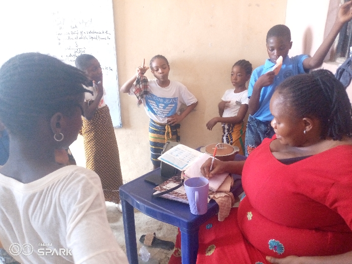 The image depicts an indoor scene in Ajaokuta, Nigeria, featuring one adult female and five children