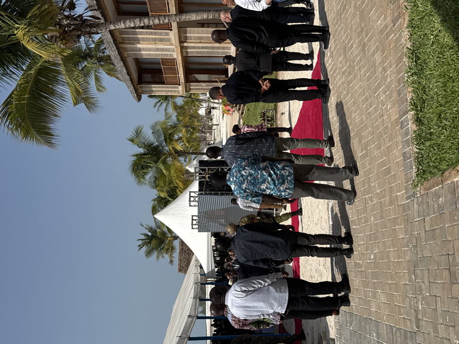 The scene depicts an outdoor event taking place in a coastal area of Zanzibar, Tanzania, under a clear blue sky. In the foreground, a paved walkway of light-colored interlocking pavers extends across the bottom, with patches of green grass visible to the right. Approximately fifteen individuals, predominantly adult males, are observed from behind, standing on this paved area and facing towards the center of the scene. Their attire varies, including light-colored long-sleeve shirts, dark t-shirts, patterned short-sleeve shirts, and dark trousers. A red carpet extends from the paved area into the midground, leading towards a gathering area. To the left, a long white rectangular event tent covers a seated audience. Adjacent to this, a white pyramidal tent stands in front of a large, vertically-oriented, silver-toned screen or stage backdrop, suggesting a performance or presentation area. Several more attendees are visible near and under these tents. One individual in what appears to be military-style camouflage fatigues is visible near the stage area. The background features a sandy beach line dotted with numerous tall palm trees. To the right, a two-story building with a thatched roof, wooden slatted balconies, and louvered shutters is prominently situated amongst the palm trees, characteristic of a tropical resort. Further down the beach, another similar structure is partially visible. The overall environment is bright and sunny.